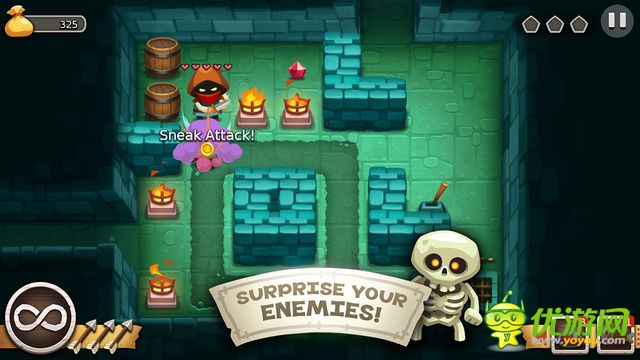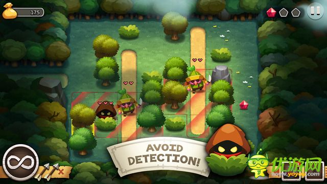 《鬼鬼祟祟-Sneaky Sneaky》是一款有著非??蓯鄣腝版畫面的策略潛行游戲,玩家將扮演一個矮矮的小盜賊在規(guī)定的森林中的格子內(nèi)移動找回寶藏。在地圖中,小人通過躲在草叢里或石頭旁偷襲小怪,如遇敵人,將自動展開回合制的戰(zhàn)斗,敵我上方均以在所在的限定方格內(nèi)移動。要盡量不要讓敵人發(fā)現(xiàn),找到的寶石可以用來購買物品道具。