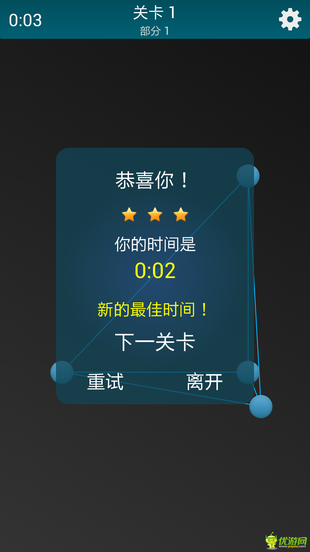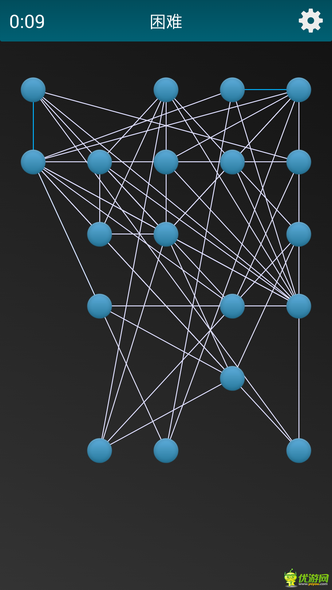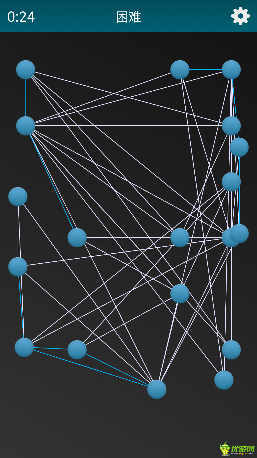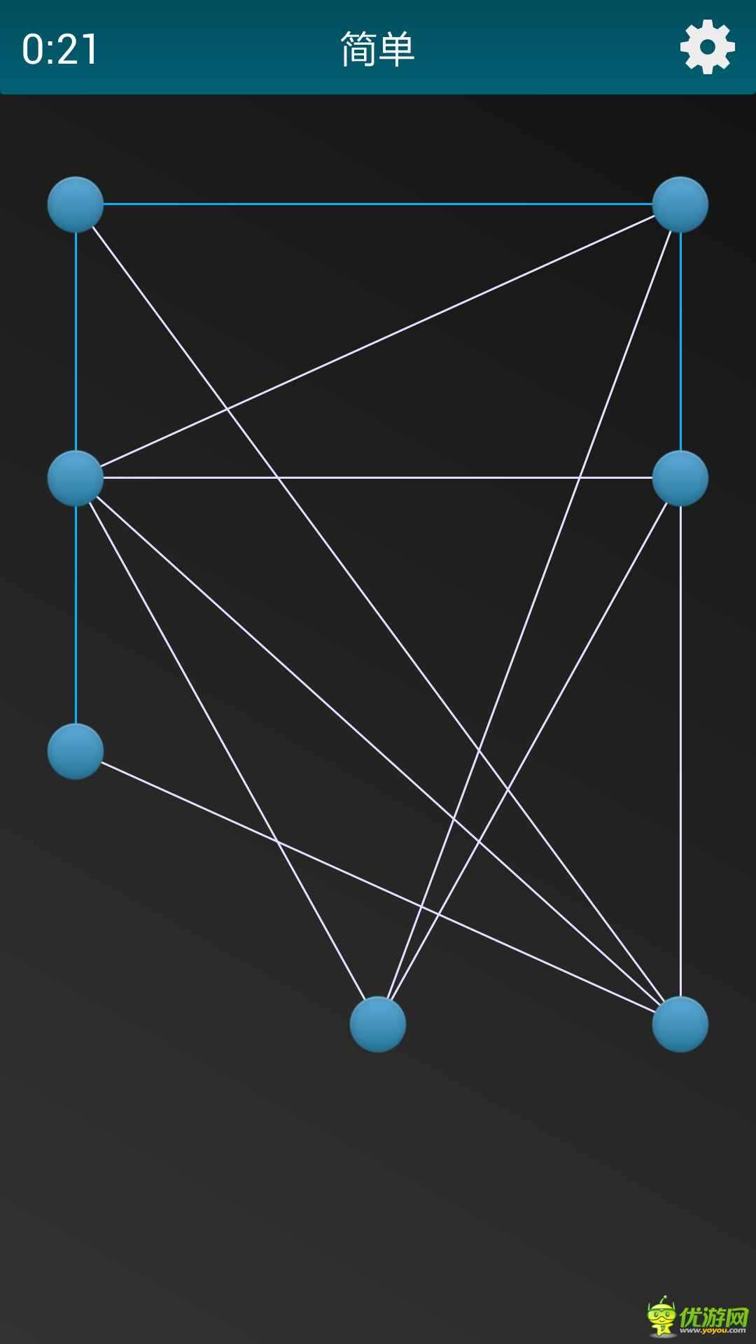 《繩索解密》是一款益智休閑虐心游戲。用最快的速度,通過拖動小球,將所有的白線變?yōu)樗{(lán)線即可過關(guān)。多試幾個就能找出游戲規(guī)則了。