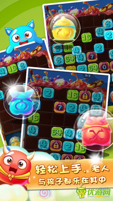 【游戲玩法】玩家滑屏來操作屏幕中的糖果進行移動,當兩個相同的數(shù)字相同就可以啪啪啪了,當所有位置被糖果填滿,游戲結(jié)束;