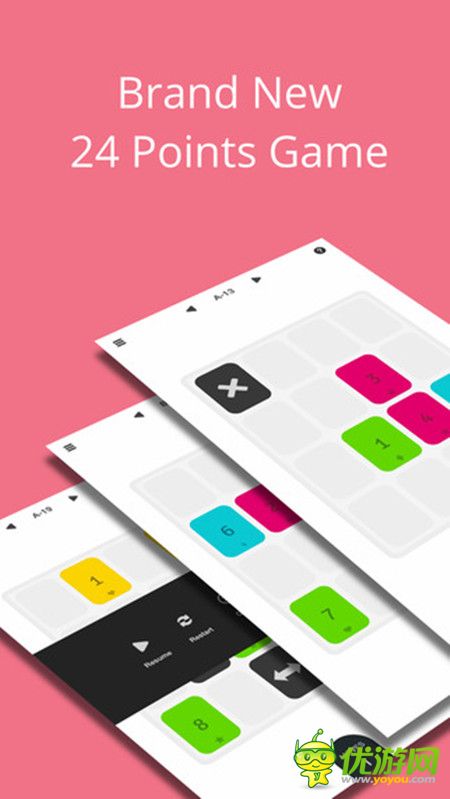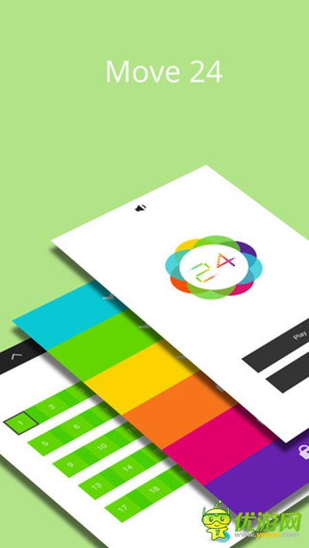 Move24是一款通過上下左右移動(dòng)在規(guī)定步驟得到24點(diǎn)的益智游戲. 移動(dòng)和運(yùn)算規(guī)則: 1、向左移動(dòng)-加 2、向右移動(dòng)-減 3、向上移動(dòng)-乘 4、向下移動(dòng)-除 5、顏色相同的數(shù)字每次會(huì)同時(shí)移動(dòng)