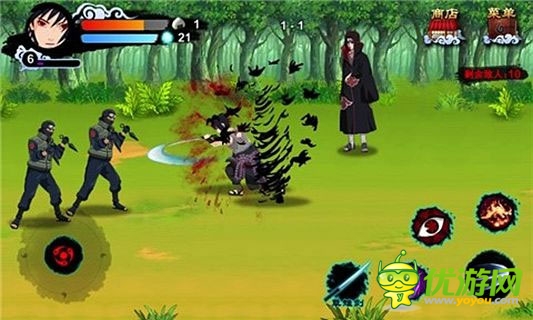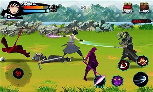 《熱血忍者2014》是一款橫版闖關(guān)動(dòng)作類游戲。游戲分3大關(guān)卡,25個(gè)小關(guān),第一大關(guān)通過(guò)后解鎖第二大關(guān)。游戲戰(zhàn)斗界面左下角為操作搖桿控制主角移動(dòng),右下角為技能按鈕和攻擊鍵和武器切換,左上角顯示主角屬性。游戲共有3個(gè)技能:火遁、天照和須佐能乎,火遁是從口出吐出火球,小范圍傷害、天照全屏黑色燃燒火焰,全屏傷害,須佐能乎佐助無(wú)敵狀態(tài),攻擊力暴增。使用需要消耗一定的查克拉。通過(guò)不停的闖關(guān)升級(jí),提升主角戰(zhàn)斗力,復(fù)仇之日指日可待。