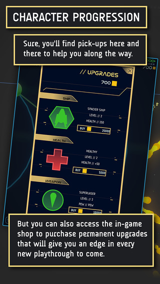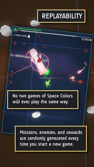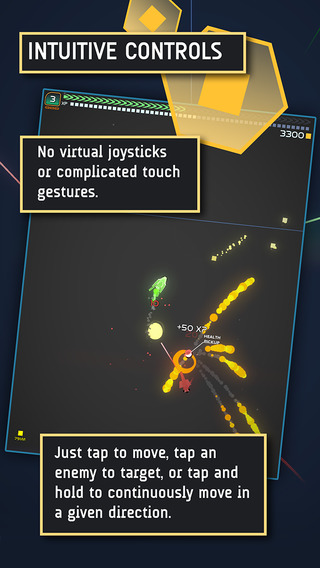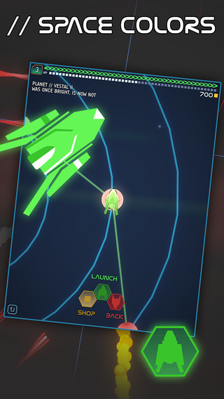 游戲中玩家需要駕駛綠色的小飛船在各種躁動(dòng)的小行星之間穿梭,同時(shí)還要注意隕石和敵人的炮火,每成功射擊一個(gè)敵人或者小行星都會(huì)釋放一大片勝利的色彩。