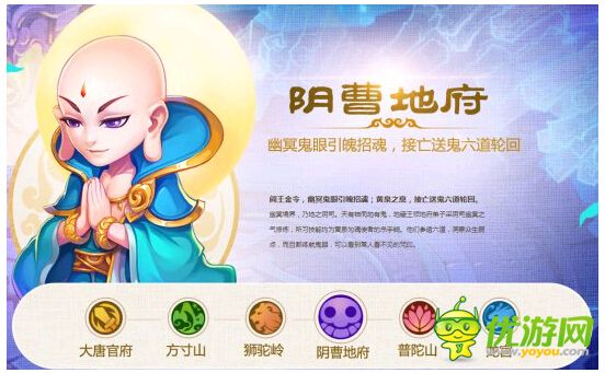 2、大唐+方寸+獅駝+普陀+地府。相比前上一個陣容,清寶寶能力較弱。但方寸的離魂符有降防效果+大唐+獅駝+地府絕技鎖魂判官,能形成非常強力的點殺體系。