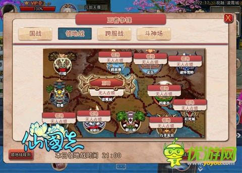 “領地戰(zhàn)”發(fā)起權僅掌握在幫主之手,申請時間為8:00-17:00,申請將以競價的形式?jīng)Q出,并在當日21:00-22:00進行決戰(zhàn)。玩家需在領地戰(zhàn)地圖內盡可能占領聲威產(chǎn)出點,勝利結算將優(yōu)先以聲威為評勝標準,如雙方聲威相同則以人數(shù)、戰(zhàn)力等為評勝標準,游戲中大部分地圖都可以占領,為屬“凌霄城”占領受益最高。