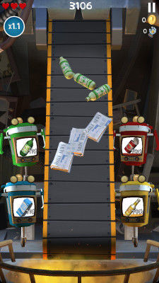 游戲的主場地是一個黑漆漆的傳輸帶,看到它,是不是感覺來到了某個加工廠中里。垃圾從頂部緩緩被送到底部的熔爐。垃圾不但顏色豐富還種類繁多,如淡藍色報紙,紅色易拉罐,藍色包裝盒,黃色果汁瓶等等??偟膩砜?,畫質(zhì)來看顯得非常平淡。如果可以修正下貼圖的鋸齒出現(xiàn),增加場景的3D渲染,增加一些光影效果,將會有不錯的畫面呈現(xiàn)出來。