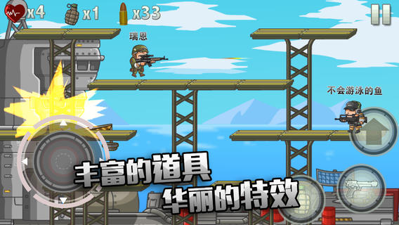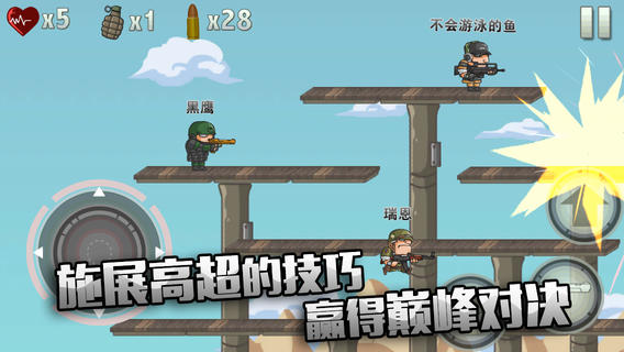 《火線奇兵:瘋狂掃射》一款冒險與射擊結(jié)合的經(jīng)典槍戰(zhàn)游戲。你將扮演反恐戰(zhàn)士,手持各種特種裝備,與反恐份子決一死戰(zhàn)。多種經(jīng)典槍支,著名的孤單英雄、大兵,會在你的手中創(chuàng)造奇跡。趕快加入戰(zhàn)斗,進行酣暢淋漓的戰(zhàn)斗,成就一段英雄傳說。游戲以簡單的橫版畫面為主,更有聯(lián)網(wǎng)與你的小伙伴一起跨越各種關(guān)卡,挑戰(zhàn)各種BOSS。游戲還支持PVP模式,跟生硬的機器人玩厭倦了還可以換換口味與同一戰(zhàn)線的小伙伴抗衡,看看誰才是真正的大兵!