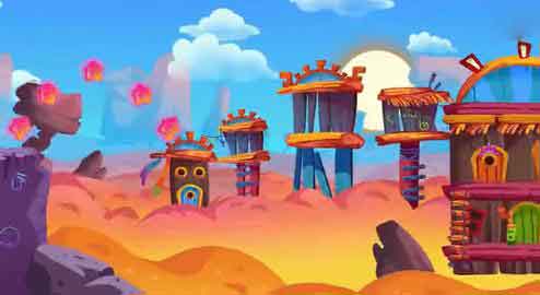 另類卡通的畫風(fēng),色彩斑斕的場(chǎng)景,僅從截圖就能夠抓住玩家的眼球,這也是游戲吸引人的地方。場(chǎng)景也非常豐富:金黃的熱帶沙漠、墨綠的熱帶叢林、幽藍(lán)的海島風(fēng)情,以及紅土上的雪原,有明顯的季節(jié)差異,而且顏色搭配方面不是單純采用與季節(jié)相映襯的單一色調(diào),相發(fā),看著畫面會(huì)讓人有眼花繚亂的感覺(jué),相信開(kāi)發(fā)商在美術(shù)設(shè)計(jì)方面也是花了不少的心思。